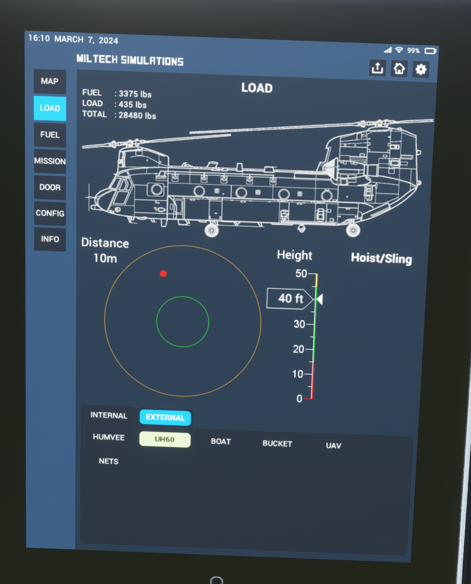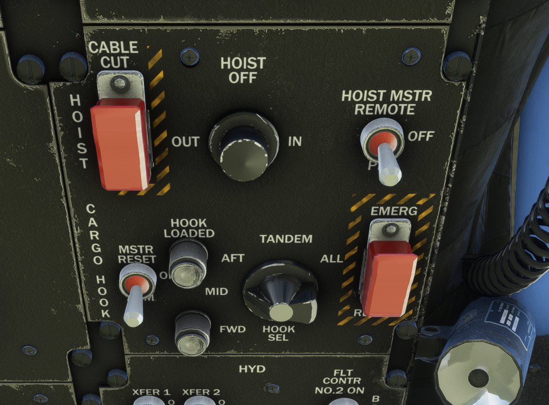 <figure><img src="https://1335574643-files.gitbook.io/~/files/v0/b/gitbook-x-prod.appspot.com/o/spaces%2FU34X0omCjZJSDMQclhSX%2Fuploads%2FWRjsWJhDwheDsDf3xP6n%2Fimage.png?alt=media&#x26;token=b67e8601-5265-448b-aea3-353cd3345c1c" alt="" width="375"><figcaption><p>Overhead Panel - CARGO HOOK Panel. Note HOOK MODE SEL is set to MID</p></figcaption></figure>