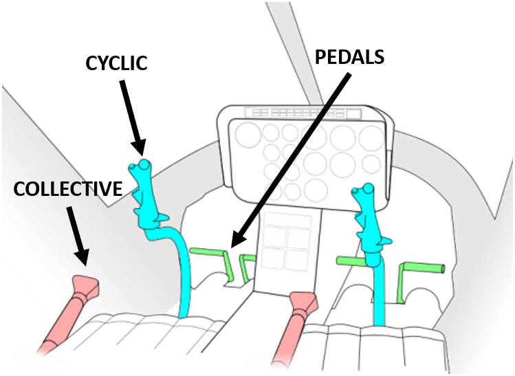 Directional Pedals: These are on the floor at your feet. Pushing the pedals lets you turn the helicopter nose left or right.