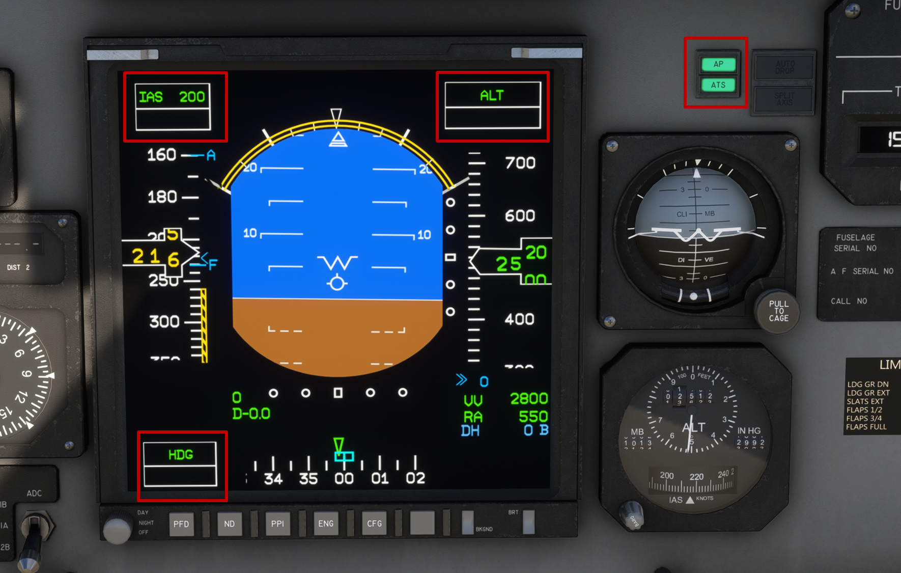 <figure><img src="https://1650965077-files.gitbook.io/~/files/v0/b/gitbook-x-prod.appspot.com/o/spaces%2FSQKfDyGFzEE2oA1hDuyJ%2Fuploads%2FflpjdAQsyYqRYkoxehyT%2Fimage.png?alt=media&#x26;token=c8d34dbf-05f1-43f6-9145-266d5c91c07b" alt=""><figcaption><p>Primary Flight Display showing active modes - IAS, ALT, HDG. Notice AP and ATS lights are active, indicating the system is engaged.</p></figcaption></figure>