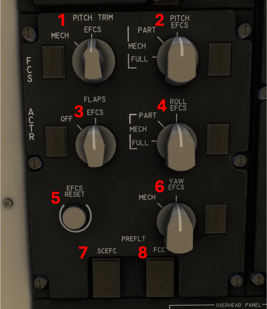 4. **Roll EFCS Selector:** Three-way switch that determines the behavior of the Electronic Flight Control System (Fly-By-Wire). “EFCS” is the regular mode, and it provides normal operation of the system. MECH (Mechanical, PART or FULL) Disables all EFCS and reverts to the mechanical backup system. The aircraft will no longer hold attitude as expected on a FBW system.