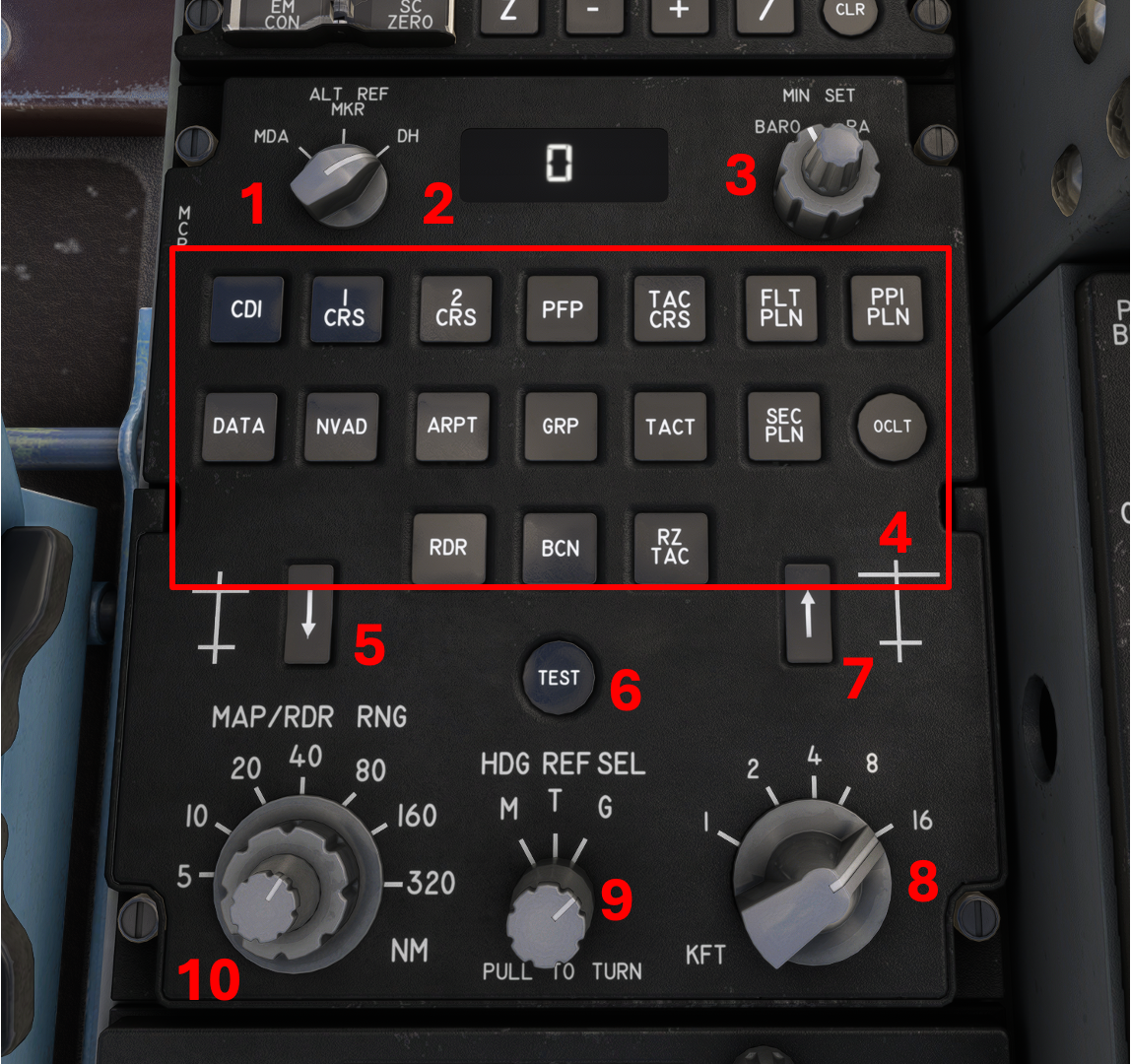 1. **Mode 1 Selector:** Select between VOR1, TACAN1 and ADF1. The instrument will use the frequencies as selected on the COMNAV display. Assuming the frequency is valid, and aircraft is within range of the radio station, the bearing to the station will display on Needle #4 and the distance on #6.&#x20;