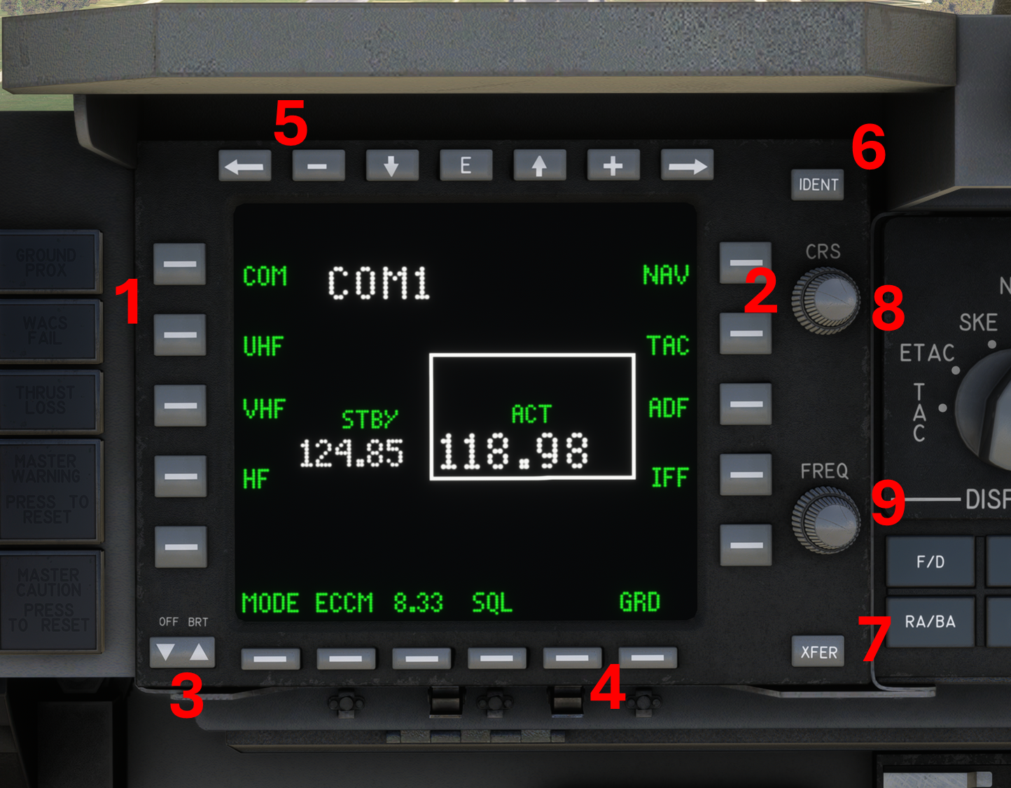 4. **Lower Side Pushbuttons:** Their functionality changes from page to page. Particularly important to change IFF mode from GRD to T/A