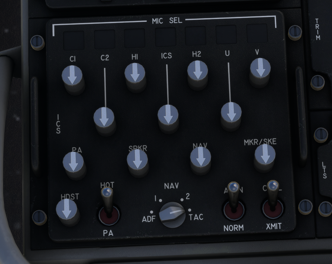 The various ICS/Radio Volume/Mic Select modules located around the cockpit are fully animated, but do not have any real functionality in the simulation. You may find them across the entire aircraft - in the centre console, on the pilot/copilot sidepanels, in the loadmaster station, etc.&#x20;