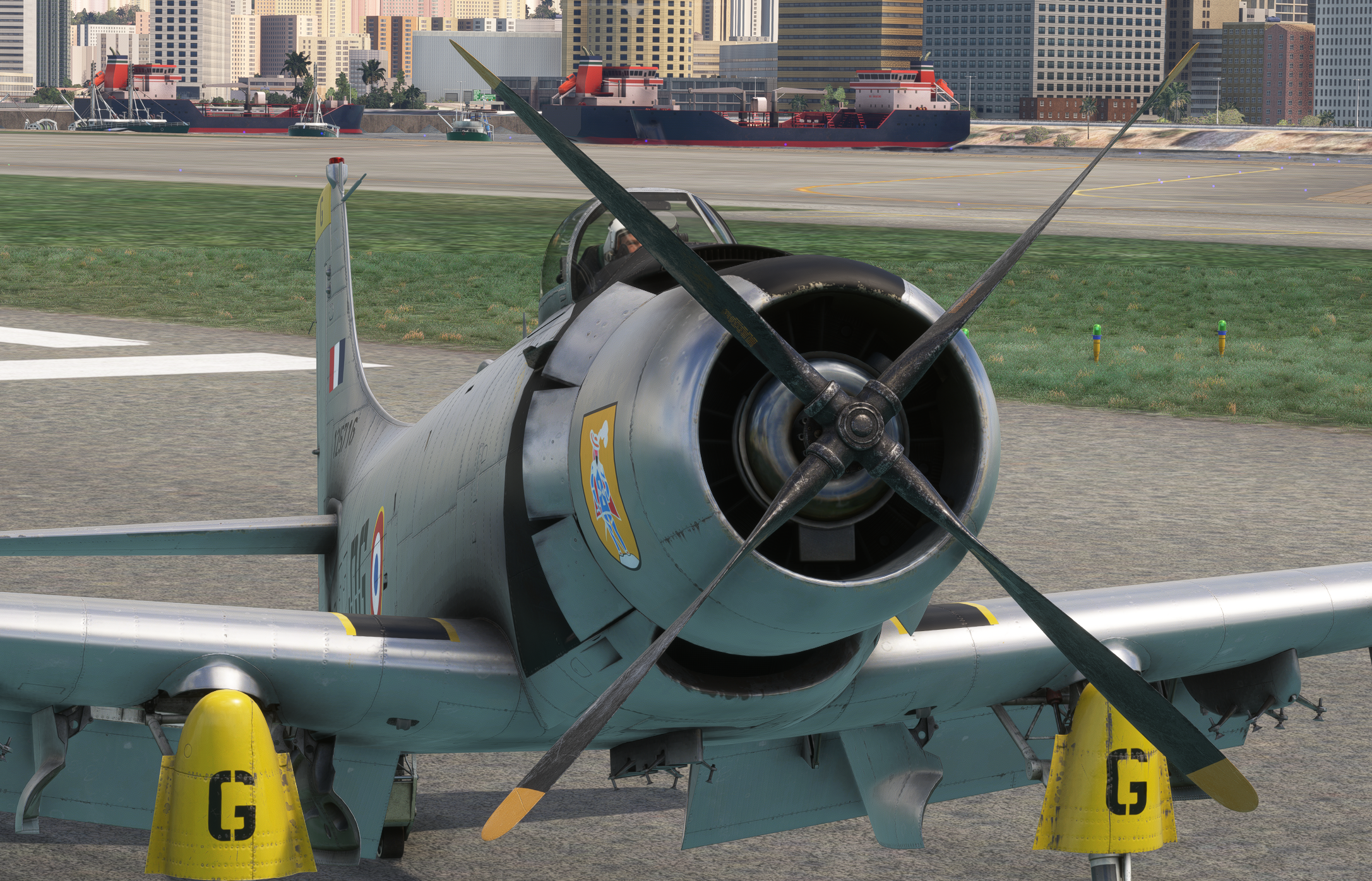 The A1H Skyraider’s large, four-blade propeller sits low to the ground and is highly susceptible to damage if excessive pitch, roll, or sink rate is maintained during taxi, takeoff, or landing. Any contact between the propeller and the ground results in immediate and catastrophic engine failure.