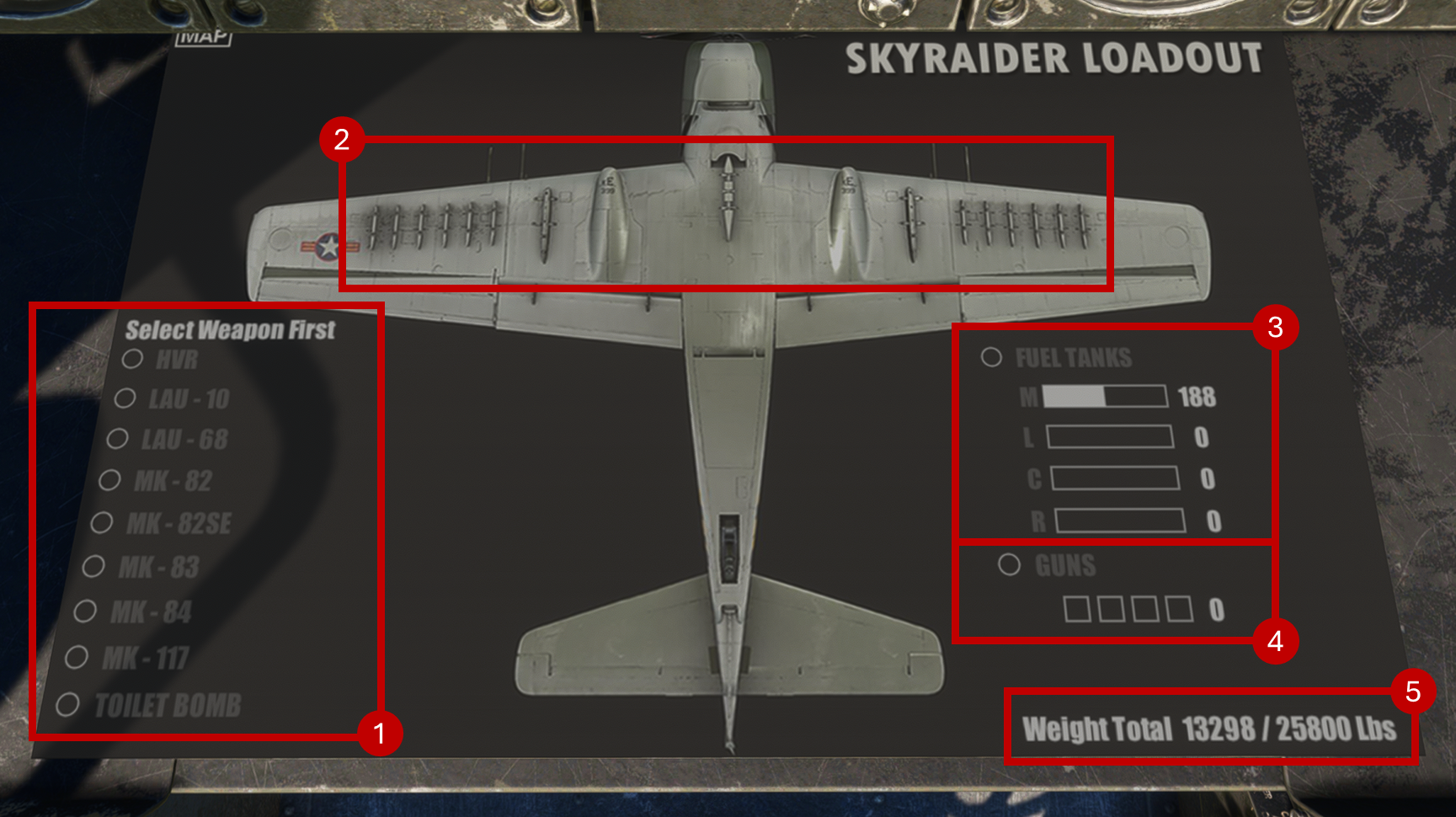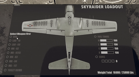 Select a weapon, then click a pylon to attach a weapon or fuel tank. Click a loaded pylon to remove it.