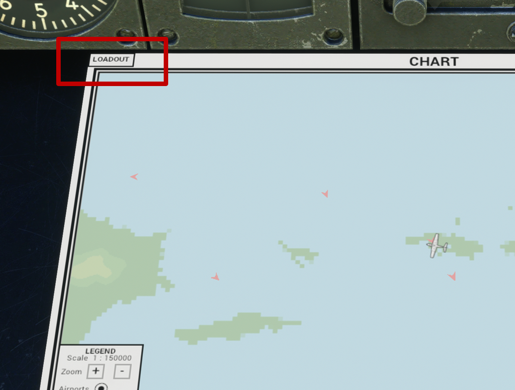 To load weapons, locate and open the tray table loadout configurator menu. Click on the upper left corner to change from Map view to Loadout view.