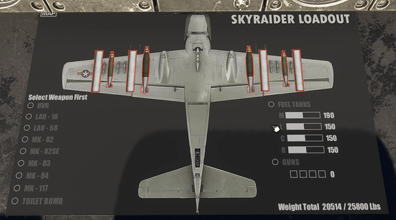 Load Fuel Tanks and Gun Ammo. Fuel Tanks are loaded similarly to weapons, by attaching to an available pylon. Hover over fuel selector to adjust fuel quantity. Load gun ammo by rounds of 200.